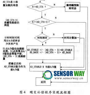 式(1)是加載到S1點天平的稱重值;式(2)是加載穩(wěn)定到S1點和進(jìn)行蠕變補償后天平的稱重值,式中載荷蠕變和受加載影響天平零點蠕變值同是ε。?蠕變跟蹤補償?shù)年P(guān)鍵是判斷和確定圖1所示的S1點、蠕變量ε與時間的關(guān)系,然后根據(jù)這一關(guān)系進(jìn)行蠕變補償。補償思路見圖4.圖4的前半段是確定S1點,后半段是蠕變跟蹤處理。這里的關(guān)鍵問題是如何確定蠕變跟蹤量和跟蹤時間的關(guān)系。圖1只定性地說明傳感器的蠕變特性,但是,每個傳感器都有定量的特性,也就是蠕變量ε與時間的關(guān)系。只有確定這一關(guān)系,才能確定蠕變跟蹤時間和跟蹤量(圖4中的AD_STA3)。解決的辦法是在天平標(biāo)定時一起確定蠕變曲線。具體做法是:加載砝碼標(biāo)定時按規(guī)程測試蠕變特性,單片機先記錄下S1點,并記錄每隔固定的時間段的當(dāng)前A/D值與S1點的差值,這就是該段時間的蠕變值。用軟件辦法記錄下這個傳感器蠕變量與時間的關(guān)系,然后再根據(jù)這一關(guān)系確定跟蹤量(AD_STA-3)和跟蹤時間。確定的原則是:固定的時間段蠕變量越大,跟蹤量(AD_STA-3)就越大和跟蹤間隔時間就越小。反之,跟蹤量(AD_STA-3)就越小和跟蹤間隔時間就越大。
