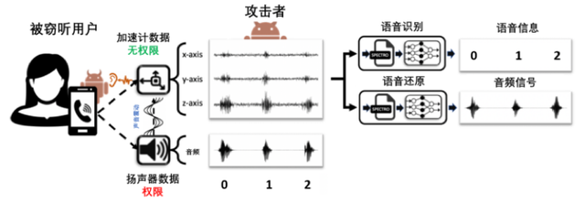“加速度傳感器是目前智能手機中最常見的一種嵌入式傳感器,主要用于探測手機本身的移動,常見的應(yīng)用場景包括移動檢測、步數(shù)統(tǒng)計、游戲控制等!比慰嬖V記者,它之所以能被用來監(jiān)聽電話,主要是由于智能手機本身的物理結(jié)構(gòu),“由于聲音信號是一種由震動產(chǎn)生的可以通過一些介質(zhì)進行傳播的聲波,因此手機揚聲器發(fā)出的聲音會引起手機的震動,而加速度傳感器可以準(zhǔn)確感知到這些震動,因此攻擊者可以通過它來捕捉聲音信號引起的手機震動進而推斷出其中所包含的敏感信息!
