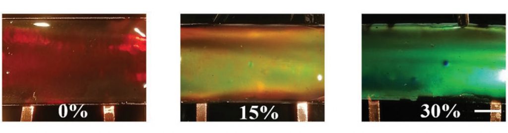 為了進一步開發(fā)這種功能性水凝膠的功能,研究人員應用了一種結構著色技術,該技術也源自自然界。結構性著色使孔雀的羽毛閃爍,并有助于偽裝變色龍。代替顏料,而是使用會干擾可見光的微觀結構表面來創(chuàng)建顏色。