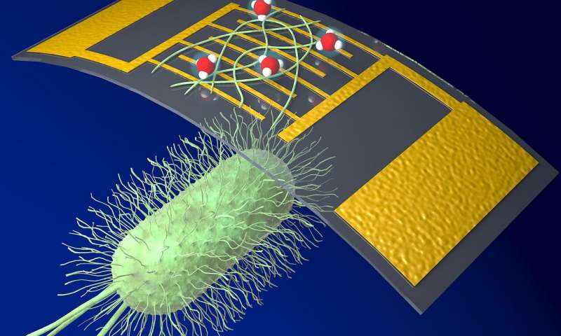 該傳感器使用源自細(xì)菌Geobacter 的導(dǎo)電蛋白納米線(xiàn)為電子設(shè)備提供生物材料。30多年前,資深作家和微生物學(xué)家德里克·洛夫利(Derek Lovley)在河泥中發(fā)現(xiàn)了Geobacter。微生物會(huì)長(zhǎng)出像頭發(fā)一樣的蛋白質(zhì)細(xì)絲,充當(dāng)納米級(jí)“金屬絲”,以轉(zhuǎn)移電荷來(lái)滋養(yǎng)它們并與其他細(xì)菌交流。