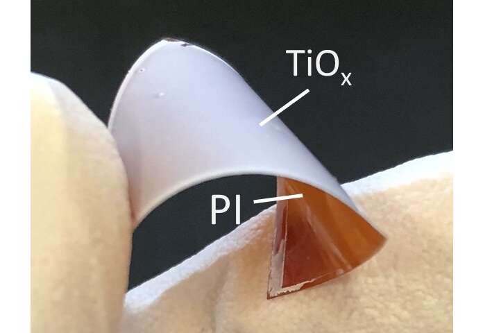 圖1沉積在塑料(PI:聚酰亞胺)基材上的納米結(jié)構(gòu)多孔氧化鈦薄膜(TiOx)。