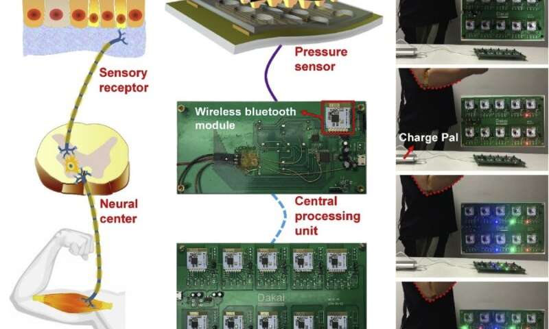 該團(tuán)隊還設(shè)計了一個人工體細(xì)胞反射弧,以模仿生物系統(tǒng)中的反應(yīng)。傳感器安裝在志愿者的肘部。隨著志愿者增加彎曲角度,信號通過無線藍(lán)牙模塊傳輸?shù)焦δ軉卧,功能單元中的LED點亮量也增加。