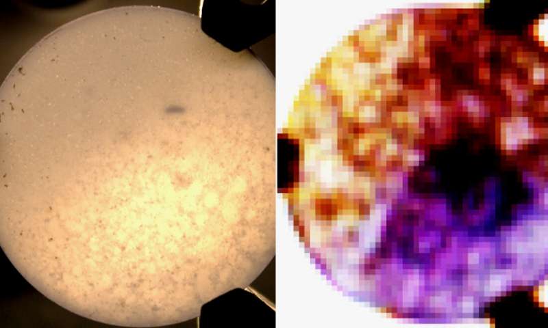 一項(xiàng)新的成像技術(shù)可快速測量固體的化學(xué)成分。樣品藥丸的常規(guī)圖像顯示在左側(cè)。在右側(cè),以太赫茲頻率觀察同一表面會發(fā)現(xiàn)各種成分具有不同的顏色。這樣的圖像將有助于藥品制造中的質(zhì)量控制和開發(fā),以及醫(yī)學(xué)診斷和治療。圖片來源:Sterczewski等。