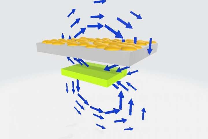 在設(shè)備制造過(guò)程中如何使用壓電共振來(lái)評(píng)估鈀顆粒之間的分離的圖示。當(dāng)將鈀納米顆粒(黃色)添加到樣品中時(shí),振動(dòng)的壓電材料(綠色長(zhǎng)方體)在基板(灰色)表面附近產(chǎn)生交變電場(chǎng)(藍(lán)色箭頭),從而在沉積的鈀(橙色顆粒)中產(chǎn)生電流。這導(dǎo)致壓電材料的一些振動(dòng)能量損失。當(dāng)鈀顆粒彼此接觸時(shí),能量損失的值最大,因此可以在最佳納米顆粒濃度下停止沉積。