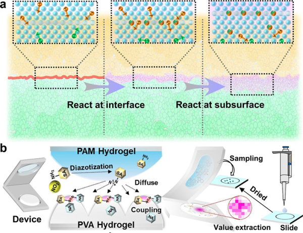 a、具有非對稱擴散的水凝膠體系示意圖;b、用于亞硝酸鹽檢測的雙層水凝膠器件