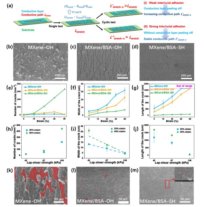為解釋界面黏附強度影響傳感器耐久性的工作機理,作者針對具有不同界面黏附的傳感器的導(dǎo)電層進行了掃描電鏡表征和分析。圖4表明,隨著界面黏附強度的提升,導(dǎo)電層在固定應(yīng)變下產(chǎn)生的裂痕大。ㄩL度和寬度)減小,但是數(shù)目明顯增多。這種現(xiàn)象是傳感器在保持較高拉伸性的前提下大幅提升拉伸性的原因。在1000次的循環(huán)測試之后,具有較弱界面黏附的傳感器產(chǎn)生了明顯的導(dǎo)電層剝落,而強界面黏附展示了穩(wěn)定的導(dǎo)電層與裂痕維持能力,這是傳感器耐久性提升的根本原因。