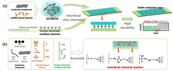 圖2 基于“點擊化學(xué)”構(gòu)建導(dǎo)電層與基底間強界面黏附推動傳感器具有高耐久性。