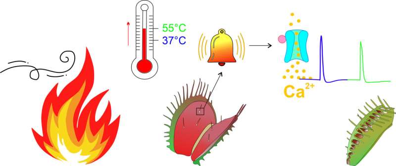 他發(fā)現(xiàn),當(dāng)葉子的局部溫度超過37°C時,捕集器的受熱區(qū)域會產(chǎn)生電脈沖,這種動作電位會傳播到捕集器的兩邊!爱(dāng)溫度進一步升高到55°C時,第二個動作電位被觸發(fā),陷阱被關(guān)閉,”壽光說。
