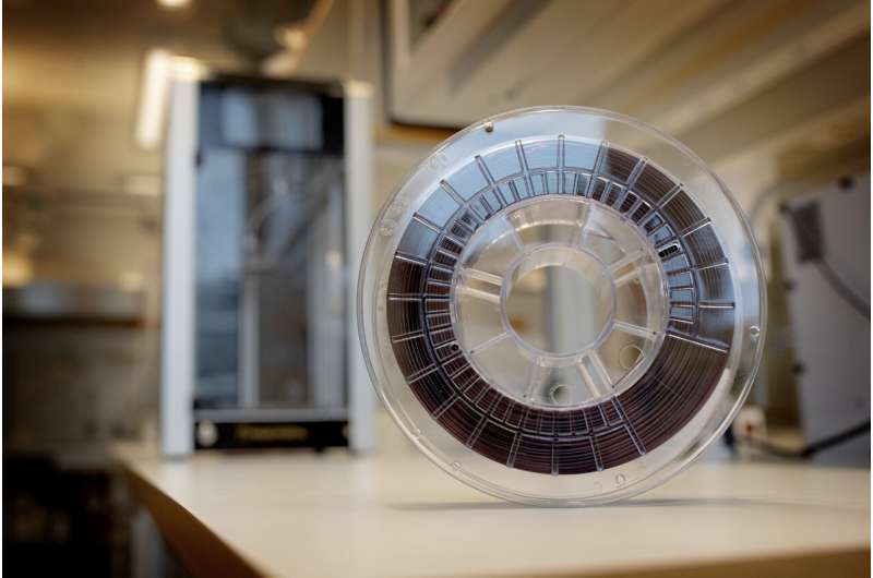 等離子體塑料的細絲。由于其柔韌性,該材料幾乎可以形成任何形狀。在這個特定示例中,燈絲旨在用于3D打印機。學分:查爾默斯/馬林·阿內(nèi)森