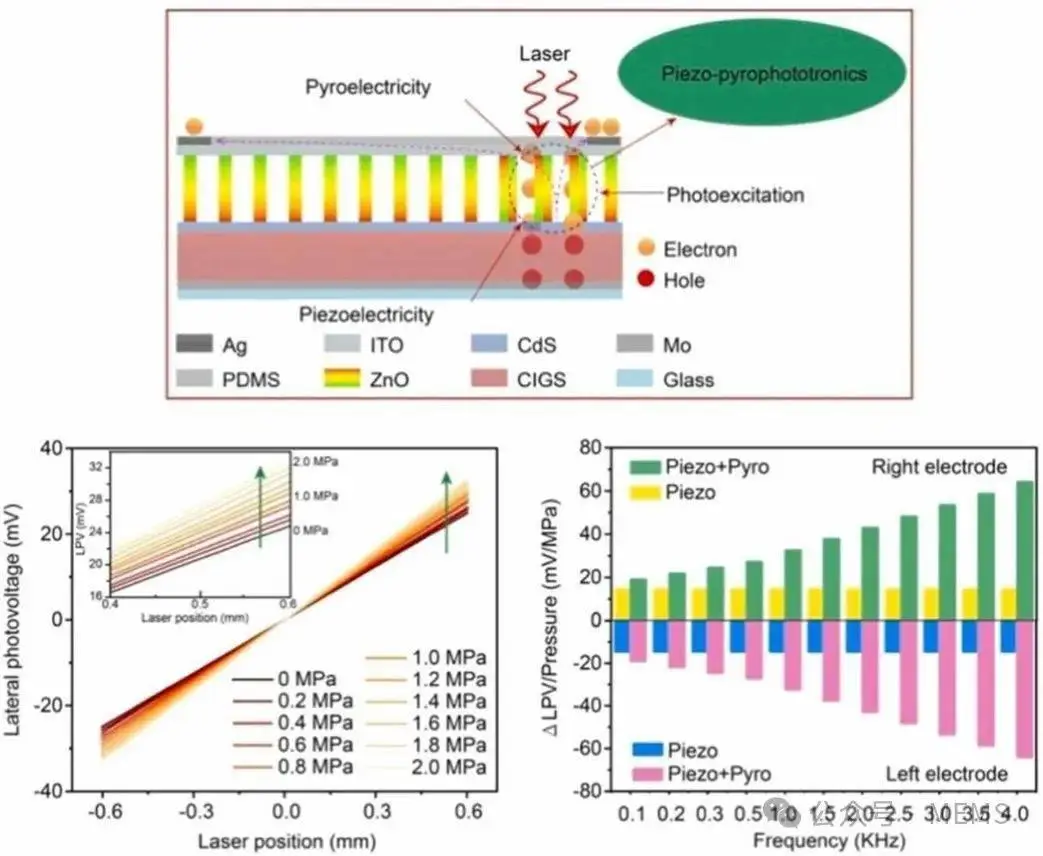 為了控制LPE性能,利用壓電光電效應(yīng)將具有c軸取向的均勻氧化鋅納米線陣列集成到異質(zhì)結(jié)中。當對異質(zhì)結(jié)施加垂直壓力時,氧化鋅納米線中由壓力引起的壓電勢會改變能帶結(jié)構(gòu),增強光生電荷載流子的傳輸,提高輸出LPV。LPV的增強取決于激光位置、功率和波長,與0~2.0 MPa外部壓力呈現(xiàn)了極好的線性關(guān)系。這表明了其寬廣的線性響應(yīng)范圍和穩(wěn)定的壓力靈敏度。此外,瞬態(tài)溫度變化誘導的熱釋電勢與脈沖激光照射下通過熱釋電光電子效應(yīng)促進的載流子梯度相耦合,最終實現(xiàn)了64.25 mV/MPa的最佳壓力靈敏度和7.8/8.9 μs的驚人快速響應(yīng)。這項研究提出了一種利用單片結(jié)構(gòu)開發(fā)基于壓電-熱釋電光電子效應(yīng)的超快、高靈敏度、自供電壓力傳感器的新方法。