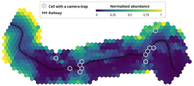 顯示鐵路路段沿線物種估計相對豐度的地圖示例。豐度越高,碰撞風(fēng)險就越高。信用:TerrOïko