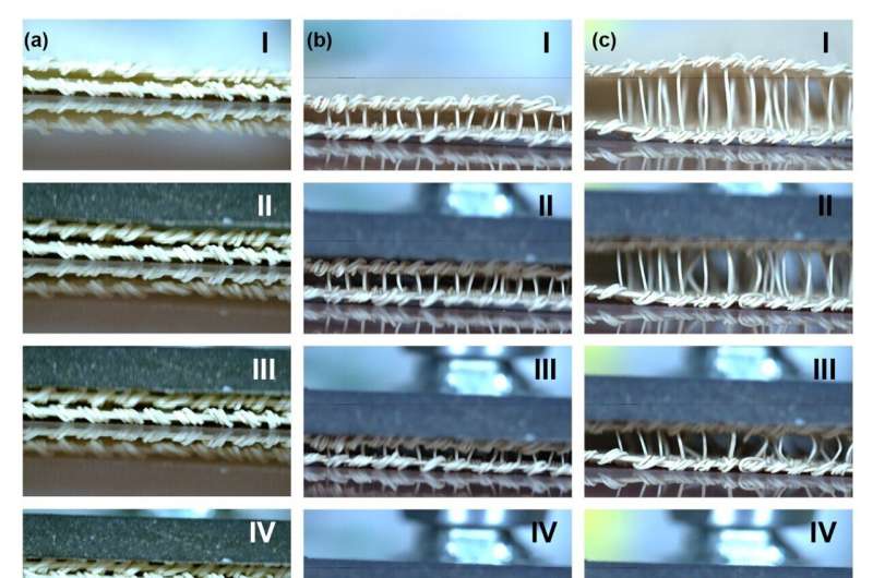 雙拉舍爾結(jié)構(gòu)隨間隔紗長度變化的變形與恢復(fù)實時觀測:(a) 2 毫米,(b) 5 毫米,(c) 15 毫米。羅馬數(shù)字對應(yīng)圖 8 中壓電能量產(chǎn)生的階段。圖片來源:《先進(jìn)功能材料》(2025)。DOI: 10.1002/adfm.202504271