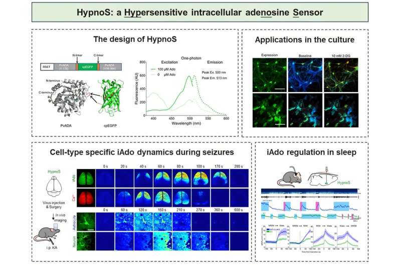 這種名為 “超靈敏細胞內(nèi)腺苷傳感器”(Hypersensitive intracellular adenosine Sensor, HypnoS)的工具,能夠在活體動物大腦中以高時空分辨率監(jiān)測癲癇發(fā)作或睡眠 - 覺醒周期中的 iAdo 動態(tài)變化。