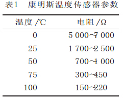 電控柴油發(fā)動(dòng)機(jī)上使用的溫度傳感器為二線式熱敏式溫度傳感器, 其外形如圖2所示。隨著溫度的升高, 熱敏電阻的阻值降低, 正常情況下阻值在500Ω~40kΩ之間變化, 表1所示為一個(gè)典型的康明斯溫度傳感器參數(shù), 具體參數(shù)值請(qǐng)參照隨電路圖提供的傳感器技術(shù)參數(shù)表。圖3為溫度傳感器的工作原理圖。隨著溫度的升高, 熱敏電阻值降低, 從而使信號(hào)電壓降低, 根據(jù)溫度傳感器的工作原理, 可以用檢查熱敏電阻阻值的方法檢查溫度傳感器, 通過(guò)對(duì)比實(shí)際測(cè)量所得的電阻值和參數(shù)表中的電阻值, 來(lái)判斷溫度傳感器是否正常。