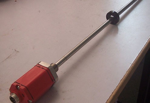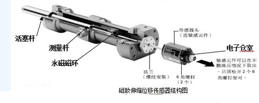 傳感器的后部是一個六角形的電子倉室,內(nèi)裝有傳感器的電子檢測線路板,通過六角形的法蘭與油缸座連接,傳感器前部是一根能耐受壓力的護套管構成的測量桿,管內(nèi)還有一根保護波導線的支撐管,支撐管內(nèi)穿有傳輸時鐘脈沖信號的波導線。測量桿整個安裝于液壓油缸的活塞桿中空的內(nèi)腔里。在活塞桿外的端部,套著一個與活塞桿同步移動的永磁性的磁環(huán),油缸活塞移動該磁環(huán)也隨之一起移動,傳感器的檢測部件即刻將活塞桿當時的位置信號測量數(shù)據(jù)計算出來,轉換成數(shù)字量信號發(fā)送給變送器。