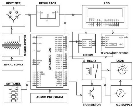LCD用于顯示-55至+125度范圍內(nèi)的溫度。EEPROM用于由用戶通過(guò)8051系列微控制器存儲(chǔ)預(yù)定義的溫度設(shè)置。該繼電器的觸點(diǎn)用于負(fù)載,由微控制器使用晶體管驅(qū)動(dòng)器驅(qū)動(dòng)。