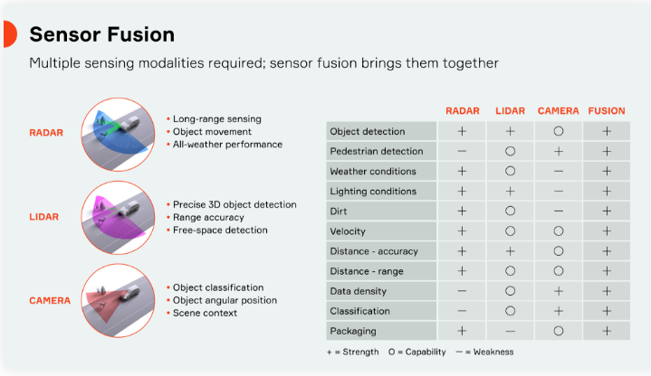 每種傳感器類(lèi)型或“模態(tài)”都有其固有的優(yōu)點(diǎn)和缺點(diǎn)。雷達(dá)即使在惡劣的天氣條件下也能精確確定距離和速度,但是卻無(wú)法讀取路牌或“看見(jiàn)”交通信號(hào)燈的顏色。相機(jī)可以很好地讀取標(biāo)志或?qū)ξ矬w進(jìn)行分類(lèi),例如行人,騎自行車(chē)的人或其他車(chē)輛。但是,它們很容易被灰塵,陽(yáng)光,雨水,雪或黑暗所蒙蔽。激光雷達(dá)可以準(zhǔn)確地檢測(cè)物體,但是它們沒(méi)有照相機(jī)或雷達(dá)的承受能力或承受能力。