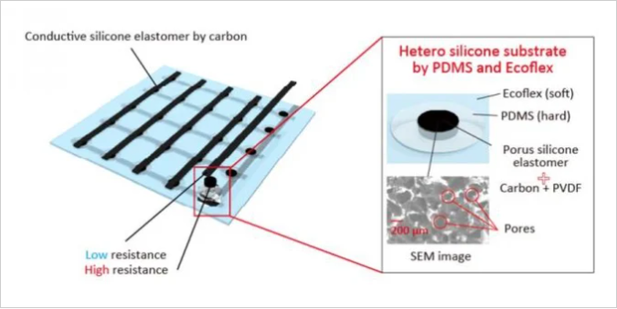 在發(fā)表的論文中,研究人員描述了使用兩種不同的材料(一種軟材料和一種硬材料)來保護傳感器伸展和準(zhǔn)確測量運動的能力。將硬硅樹脂(PDMS)沿著陣列上的電極放置,并在每個放置的核心處放置可感測壓力的柔軟的多孔硅樹脂。
