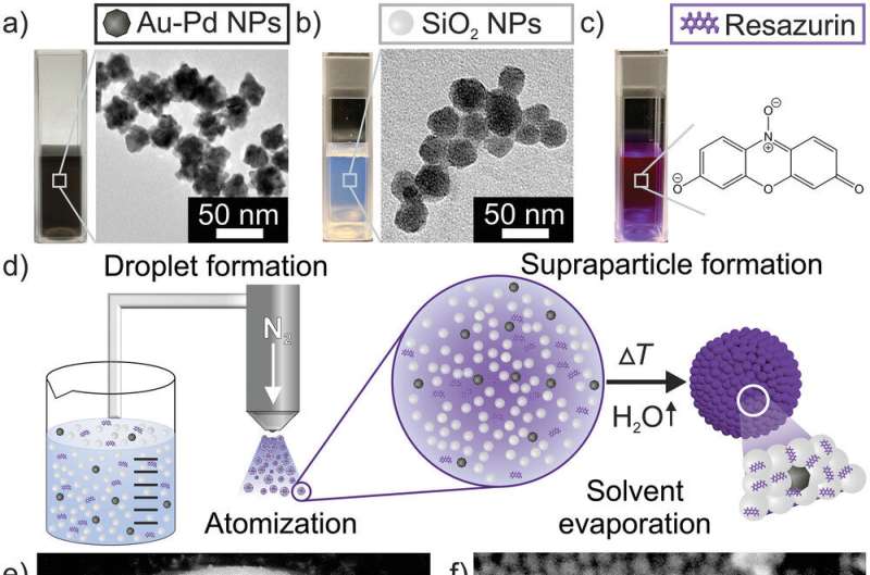 H 2指示劑 SP 的構(gòu)建模塊、制造和形態(tài)表征:a) Au-Pd NP 和 b) SiO 2 NP 分散體的數(shù)碼照片和 TEM 顯微照片;c) 刃天青染料水溶液的數(shù)碼照片;d) 通過液滴蒸發(fā)(使用噴霧干燥作為工具)將 SP 制造成自由流動的紫色粉末的示意圖;e) SP 和 f) 其表面的 SEM 顯微照片。來源:先進(jìn)功能材料(2022)。DOI: 10.1002/adfm.202112379
