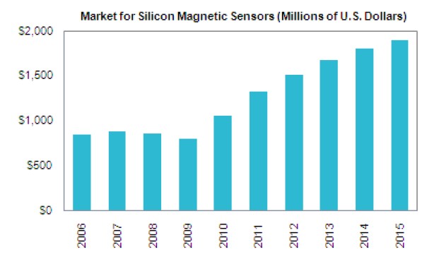 磁傳感器進(jìn)入了加速發(fā)展的時代。度過了2009的低潮,到了2010基于硅的磁傳感器有了快速的增長,覆蓋了各個領(lǐng)域,特別是在汽車和消費(fèi)市場領(lǐng)域。從2009年到2010年數(shù)量增加了38%。預(yù)期這個市場在2015年將會達(dá)到19億美金,比2010年的11億美金,復(fù)合增長率為12%。