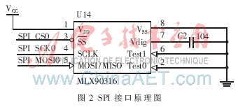 MLX90316具備1路SPI接口,用于角度信號(hào)的數(shù)據(jù),由于串行通信的輸出信號(hào)直接來(lái)自于內(nèi)部DSP輸出,SPI輸出模式更穩(wěn)定,誤差更小,并且具有更高的抗干擾能力,在本設(shè)計(jì)中,選用SPI接口,具體的硬件接口連接電路如圖2所示。在圖2中,MLX90316的SPI 3根線與LPC2136的SPI0口連接。SPI(Serial Protocol Interface)總線接口是一種同步串行外設(shè)接口。這是一個(gè)4根信號(hào)線的串行接口協(xié)議,包括主、從兩種模式。這4根信號(hào)線分別是:時(shí)鐘線(SCK)、數(shù)據(jù)輸入線(MISO)、數(shù)據(jù)輸出線(MOSI)和從設(shè)備使能線(/SS)。