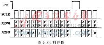 SPI接口中,LPC2136作為主控端,MLX90316作為從屬端。SPI通信模塊主要讓LPC2136讀取MLX90316的磁敏角度,SPI的通信過(guò)程為:主控端先輸出一個(gè)0xAA以及一個(gè)0xFF作為通信起始信號(hào),接著輸出8個(gè)0xFF,而從端會(huì)同時(shí)輸出2個(gè)0xFF、4 B的角度信號(hào)以及4個(gè)0xFF,從而完成一次數(shù)據(jù)通信。具體的通信時(shí)序如圖3所示。