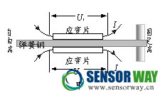 應(yīng)變片結(jié)構(gòu)如圖乙所示,其中金屬電阻絲的阻值對(duì)長度變化很敏感.給上、下金屬電阻絲提供相等且大小不變的電流,上應(yīng)變片兩引線間電壓為U1,下應(yīng)變片兩引線間電壓為U2,傳感器把這兩個(gè)電壓的差值U(U=U1-U2)輸出,用來反映力F的大小。