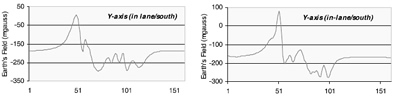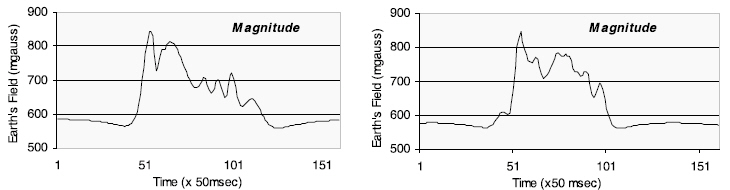 圖4,轎車(右)與面包車(左)經(jīng)過時(shí)磁場產(chǎn)生的畸變。