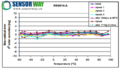 圖 3: 剩余偏置隨溫度而變化(經(jīng)過 4 階多項式校正之后) 包括在 85℃下老化、并以 1000g 沖擊 10 天