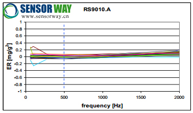 圖 6: 在20至500Hz和500至2000Hz頻率范圍,RS9010.A振動整流誤差<100μg/g2。此圖形由37只不同的傳感器疊加而成