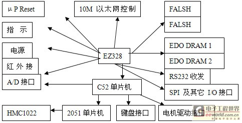 本文的課題背景是一個機(jī)器人玩具的控制系統(tǒng)設(shè)計,主芯片采用的是以摩特羅拉公司的MC86EZ328芯片,只完成與通信、運(yùn)算等有關(guān)的主要操作,在沒有操作時,由運(yùn)行于其上的操作系統(tǒng)uClinux來維護(hù)。對于所有與EZ328的核心運(yùn)算、控制、通信、操作無關(guān)的外圍設(shè)備的維護(hù)和控制都通過一塊AT89C52來完成,它與EZ328的底層通信協(xié)議為同步串口協(xié)議(SPI),在AT89C52中由軟件來實(shí)現(xiàn)。C52包含的部件主要是A/D轉(zhuǎn)換器,鍵盤接口,電機(jī)驅(qū)動模塊。硬件結(jié)構(gòu)電路圖如下圖1: