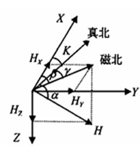 HMC的輸出電壓為磁場強(qiáng)度為0時傳感器的輸出。所以當(dāng)U0為0時, Uout正比于磁場強(qiáng)度B。如圖4,假設(shè)機(jī)器人處于水平面上,X為機(jī)器人行進(jìn)方向,Y為水平面上垂直X的方向向右(即X順時針轉(zhuǎn)90),地里北極方向和地磁北極方向如圖所示。H為地磁場,Hx、Hy分別是H在X、Y方向的水平分量, β為機(jī)器人行進(jìn)方向和地磁北極方向的夾角, γ為地磁北極和地理北極方向的夾角,K就是機(jī)器人行進(jìn)方向與地理北極方向之間的夾角,也就是我們最終要求的角度。(此處的β、γ、 K都是由前者出發(fā)順時針到達(dá)后者的角度)由圖可明顯看出,K= β-γ。而在地球上不同方位的γ可查表得出,所以關(guān)鍵就是求得 。由磁阻傳感器可以得出Hx、Hy,(此處忽略了機(jī)器人在Z軸方向的傾斜,所以二維傳感器就夠用了),