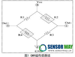 VA系列巨磁電阻磁傳感器采用惠斯通橋式結(jié)構(gòu),如圖1所示的。圖中,R1和R3是兩個(gè)阻值一樣的電阻,可隨外界磁場的變化輸出一個(gè)差分電壓信號,R2和R4由于屏蔽層的作用不感應(yīng)外界磁場的變化。