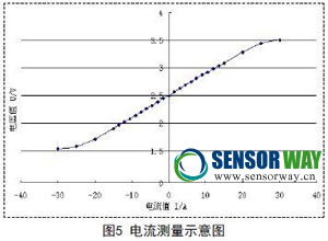 在實(shí)際應(yīng)用中,待測電流有正負(fù)之分,產(chǎn)生的磁場有正負(fù)之分,因此,在測試過程中,通過改變磁場方向和電流的方向來檢測GMR傳感器和電流傳感器測試性能。圖5是電流從-30A到+30A變化時(shí)電流傳感器輸出曲線。