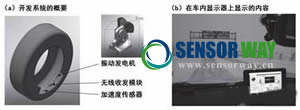 普利司通開發(fā)出了利用輪胎內(nèi)側(cè)安裝的加速度傳感器數(shù)據(jù)判斷路面狀況的技術(shù)(a)。判斷的路面狀況結(jié)果顯示在車內(nèi)的顯示器上(b)。