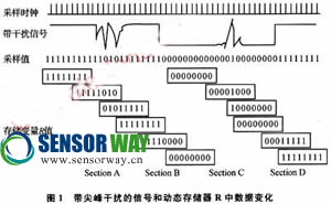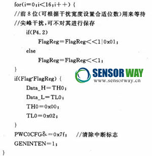 在圖1中,從正常下降沿過程(Section B),可以看到變量R中的數(shù)據(jù)經(jīng)歷了從各位全為1,到1、0共存,再變化到全為0的過程;然而,在高電平段的干擾部分(SectionA),變量R經(jīng)歷了從全為1,到1、0混合,再回到全為1的過程。類似地,正常上升沿(Section D)變量R經(jīng)歷了各位全為0,到0、1共存,再變化到全為1的狀態(tài)變化過程;在低電平段的干擾部分(Section C),變量R經(jīng)歷了采樣狀態(tài)從全為0,到0、1混合,再回到全為0的過程。通過判斷此4種情況下變量R中數(shù)據(jù)的不同變化過程,可以達到從正常變化中辨別出干擾的目的。這就是本設計所采用的軟件濾波抗干擾方法的基本思想。