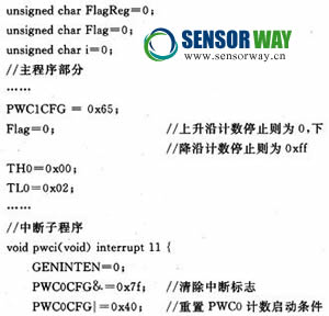 對應程序流程圖,給出了單片機通過P4.2口對ADXL202某一輸出通道采樣濾波并完成脈寬計數(shù)的源程序。源程序如下: