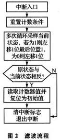 根據(jù)軟件濾波設計思想,濾波子程序由主程序在信號狀態(tài)發(fā)生變化,進入中斷時調(diào)用,圖2給出了濾波程序流程。對照圖1中4種Section來分析流程圖。當有邊沿或干擾信號(信號周期大于計數(shù)時鐘周期)到來時,VRS51L3074單片機的PWC計數(shù)停止條件滿足,系統(tǒng)進入中斷服務子程序。在中斷子程序中,首先重置脈寬計數(shù)條件,然后對當前狀態(tài)進行采樣,采樣1次,狀態(tài)寄存器左移1位,采樣到高電平記為“1”,采樣到低電平記為“0”。如正常下降沿Section B,前面處于高電平段,初始狀態(tài)變量Flag全為1,當出現(xiàn)低電平,控制器進人中斷,緊接著進行16次采樣。前已提及系統(tǒng)處理的尖峰干擾約1~2 ms,每個采樣周期約為0.4 ms,其尖峰干擾脈寬達不到8個采樣周期。系統(tǒng)設計時采樣16次,只取最后8次的存儲狀態(tài)與原狀態(tài)進行比較,如果最后采樣的狀態(tài)全為“0”則與原狀態(tài)相反,就可判斷出這是1個正常下降沿。如果是干擾信號引起計數(shù)中斷,前面8個采樣狀態(tài)不全為“1”,后面8個狀態(tài)全為“1”,最后采樣的狀態(tài)與原狀態(tài)相同,就可判斷出這是1個干擾信號,如Section A。在信號狀態(tài)采樣期間,計數(shù)條件滿足PWC繼續(xù)計數(shù),直到真正的下降沿到來,計數(shù)停止并保存,計數(shù)寄存器還原為初始值,這樣干擾信號即被濾除。類似地,正常上升沿Section D,存儲器原狀態(tài)為“0”,上升沿來臨后存儲器狀態(tài)為“1”,與原狀態(tài)相反,PWC計數(shù)停止并保存,計數(shù)寄存器還原為初始值,退出中斷子程序。有干擾信號出現(xiàn)后采樣狀態(tài)與原狀態(tài)相同,干擾尖峰脈沖可被濾除。如果要使脈寬計數(shù)更精確,可判斷前8個采樣周期中系統(tǒng)不正常計數(shù)的周期,然后與最終計數(shù)周期相加即可。此時,程序流程體現(xiàn)出軟件濾波功能。
