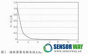 光電傳感器的輸出電流ICON是光電傳感器一個(gè)十分關(guān)鍵的參數(shù)。對(duì)槽型光電傳感器而言,在給定條件下,ICON不僅與發(fā)射器輻射強(qiáng)度Ee、接收器集電極電流IC有關(guān),還和發(fā)射器與接收器的距離以及發(fā)射器與接收器前槽縫的寬度有關(guān)。圖1為側(cè)面發(fā)光發(fā)射器與側(cè)面受光接收器之間距離改變時(shí),發(fā)射器電流10 mA時(shí)測(cè)量得到的接收器集電極電流IC隨距離的變化曲線。距離越大,相同條件下接收器集電極電流IC就越小。而發(fā)射器與接收器前槽縫的寬度越大,相同條件下光電傳感器的輸出電流ICON就越大。在槽型光電傳感器設(shè)計(jì)過程中,發(fā)射器輻射強(qiáng)度與接收器集電極電流應(yīng)結(jié)合發(fā)射器與接收器之間的距離,以及槽縫寬度進(jìn)行選取。
