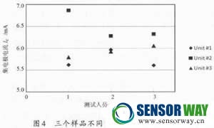 。4)測(cè)試誤差。在發(fā)射器與接收器測(cè)試過程中,由于機(jī)臺(tái)、測(cè)試人員不同,會(huì)導(dǎo)致測(cè)試結(jié)果的變差。圖4為3位測(cè)試人員在同一機(jī)臺(tái)測(cè)試相同的三個(gè)接收器樣品得到的結(jié)果。由圖可見,樣品2不同集電極電流測(cè)試值之間的最大差值甚至略高于0.5 mA.測(cè)試誤差與機(jī)臺(tái)的測(cè)量精度、測(cè)試過程中用于固定元件的夾具的精度等有關(guān)。