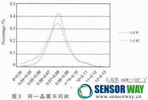 (3)發(fā)射器輻射強(qiáng)度及其空間分布上的變化晶片位置對(duì)發(fā)射器輻射強(qiáng)度及在空間分布有影響。在設(shè)計(jì)條件下,晶片位于發(fā)射器透鏡的中心線上。但在發(fā)射器的生產(chǎn)制造過程中,固晶(die_attach)和封膠(encapsulation)這兩道工序都可能使晶片偏離中心線,而封膠過程造成的偏離一般會(huì)更大。圖3為同一晶圓(wafer)不同批次(lot)發(fā)射器輻射強(qiáng)度的分布。由圖可見,批次1輻射強(qiáng)度在0.07~0.08 mW/10°范圍內(nèi)發(fā)射器的比例為34.2%,而批次2輻射強(qiáng)度在相同范圍內(nèi)的比例為41.8%。由于發(fā)射器輻射強(qiáng)度的測(cè)試與發(fā)射器在光電傳感器中的使用條件一般并不相同,輻射強(qiáng)度在空間分布的變化有可能導(dǎo)致在相同條件下,裝配測(cè)試得到的高輻射強(qiáng)度發(fā)射器的光電傳感器,其輸出電流反而比裝配測(cè)試得到的低輻射強(qiáng)度發(fā)射器的光電傳感器低。另外,通常情況下用于填充反射杯和覆蓋晶片的硅膠的折射率與封膠用的環(huán)氧樹脂(epoxy)的折射率十分接近,故硅膠與環(huán)氧樹脂交界面的形狀對(duì)發(fā)射器的輻射強(qiáng)度分布的影響很小。但若兩者有一定差別,則交界面的形狀會(huì)對(duì)發(fā)射器的輻射強(qiáng)度分布產(chǎn)生影響,這種情況下控制點(diǎn)膠工序中所用硅膠的量相同或相近十分重要,以便使不同發(fā)射器硅膠與環(huán)氧樹脂交界面的形狀保持一致,避免由此引起發(fā)射器輻射強(qiáng)度在空間分布的變化。