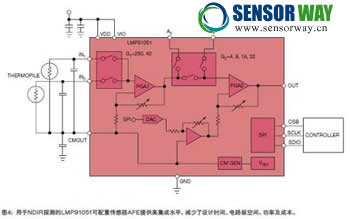 同樣,NDIR系統(tǒng)需要一個基準(zhǔn)通道、可調(diào)放大倍率、偏移補償,以及偏置。LMP91051可配置傳感器AFE為NDIR探測應(yīng)用完成這些工作(圖4)。它有一個雙通道輸入,支持活動通道和基準(zhǔn)通道、PGA、可調(diào)偏移抑制DAC,以及共模發(fā)生器。LMP91051能夠?qū)⑦@些重要的NDIR系統(tǒng)塊集成到一起,從而減少了設(shè)計時間、電路板空間、功率,以及成本。
