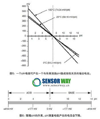 pH電極產(chǎn)生的電壓輸出與待測溶液的pH值呈線性關(guān)系。圖5和圖6中的傳遞函數(shù)與pH范圍表明,當(dāng)溶液的pH升高時,pH測量電極所產(chǎn)生的電壓下降。注意,pH電極的靈敏度會隨溫度而改變。圖中的pH電極傳遞函數(shù)顯示,靈敏度會隨溫度而線性地增長。由于這一特性,關(guān)鍵是要了解待測溶液的溫度,并對測量作相應(yīng)補償。