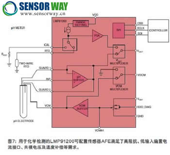 最后,pH傳感器需要一個高阻、低輸入偏移電流的接口、共模電壓,以及溫度補償能力。用于化學(xué)探測的LMP91200傳感器AFE就具備了這些功能(圖7)。用它的可編程電流源就可以方便地與RTD連接。它的多步溫度測量功能消除了溫度信號路徑中的誤差,從而進(jìn)一步提高了溫度測量的精度。該器件的輸入偏置電流在25C時只有數(shù)十fA量級,從而與高阻pH電極連接時最大限度地減少了誤差。最后,當(dāng)器件關(guān)斷時,偏置電流只有數(shù)百fA,減少了由于拉出電流而帶來的電極衰退。