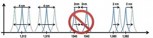 圖4.同一條光纖上掛接的每一個(gè)FBG傳感器必須具有其獨(dú)立的工作波長范圍