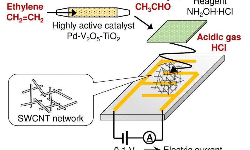 在此研究項目中,我們開發(fā)了一種小型,高靈敏度的傳感器,能夠以高選擇性檢測乙烯。該傳感器由三部分組成:一種高活性催化劑,可選擇性地將乙烯轉(zhuǎn)化為乙醛;一種與乙醛反應(yīng)以釋放酸性氣體的試劑;以及一個對酸性氣體非常敏感的SWCNT(單壁碳納米管)電極(圖)。當(dāng)分析物空氣通過時,這種高活性催化劑可以將乙烯反復(fù)轉(zhuǎn)化為乙醛。此外,該催化劑可在接近室溫(40℃)的條件下運(yùn)行,從而使小型傳感器具有較高的能源效率。乙醛與試劑之間的反應(yīng)產(chǎn)生的酸性氣體會從SWCNT半導(dǎo)體中強(qiáng)烈吸收電子,從而改變半導(dǎo)體的電阻。這些特性和機(jī)制使傳感器能夠通過監(jiān)視電阻變化,即使在極低的濃度(0.1 ppm)下也能夠選擇性和靈敏地檢測乙烯。該傳感器有望有效監(jiān)測多種類型乙烯的乙烯濃度。儲存新鮮農(nóng)產(chǎn)品。例如,促進(jìn)香蕉和獼猴桃中成熟的乙烯濃度分別約為500 ppm和10 ppm:完全在傳感器的有用靈敏度范圍內(nèi)。