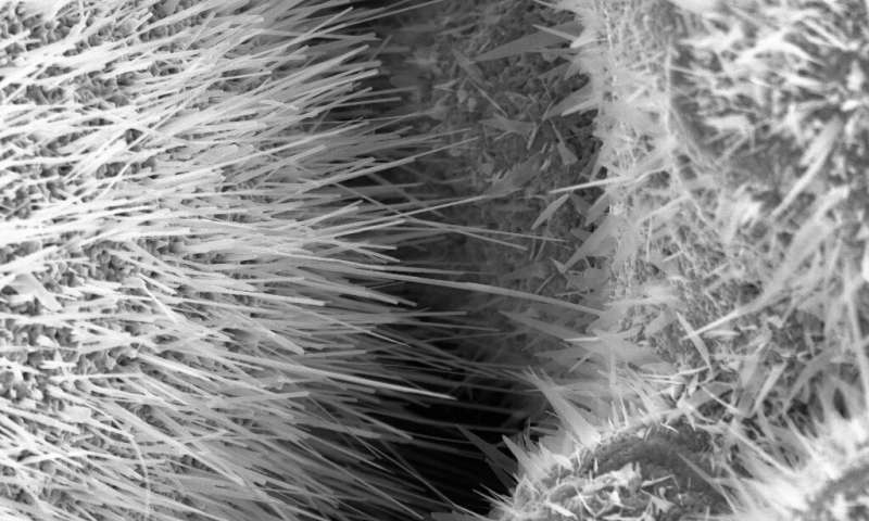 顯微鏡下的傳感器表面:研究小組從金屬微粒中生長出細(xì)小的金屬絲和尖峰,這些金屬微粒特別擅長捕獲氣體分子。圖片來源:功能納米材料工作組