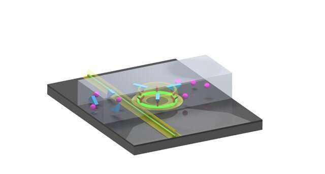 泵浦光耦合到設(shè)備,在微環(huán)諧振器中產(chǎn)生激光。諧振器的表面裝有捕獲感興趣的分析物的探針(環(huán)上的紅色錨分子)。環(huán)中的激光延伸到流體中。當(dāng)感興趣的分析物(藍(lán)色三角形)附著在捕獲探針上時(shí),微環(huán)激光器外部的場會(huì)感應(yīng)到這種情況,從而改變了激光發(fā)射的頻率。可以非常精確地測量此偏移,從而可以檢測到以“特定”方式流過傳感器的微量分析物(即,粉紅色顆粒沒有與捕獲層結(jié)合,因此無法檢測到)。在圖中,波導(dǎo)是綠色的(由誘導(dǎo)激光發(fā)射的摻雜劑的上轉(zhuǎn)換產(chǎn)生的真實(shí)顏色),并且可以看到微流體通道,其中不同的顆粒從左到右流動(dòng)。圖片來源:Rick Seubers,特溫特大學(xué)光學(xué)科學(xué)組