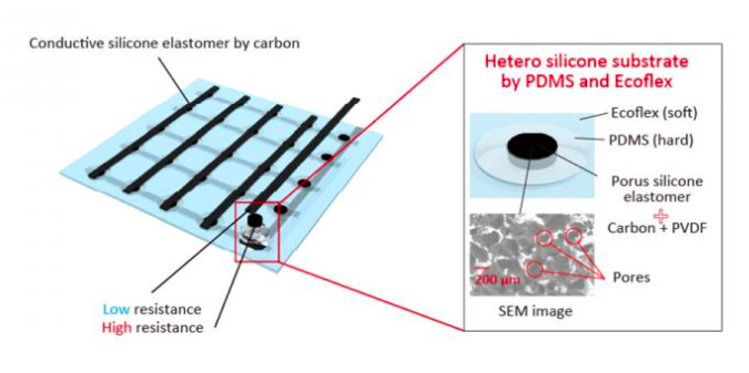 在發(fā)表的論文中,研究人員描述了使用兩種不同的材料(一種軟材料和一種硬材料)來(lái)保護(hù)傳感器伸展和準(zhǔn)確測(cè)量運(yùn)動(dòng)的能力。將硬硅樹(shù)脂(PDMS)沿著電極放置在陣列上方,并且在每個(gè)放置的核心處,他們都放置了可感知壓力的柔軟的多孔硅樹(shù)脂。