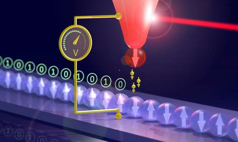 實驗裝置的示意圖:掃描隧道顯微鏡的尖端被激光束加熱,產(chǎn)生電壓,該電壓用于從磁性原子讀取信息。